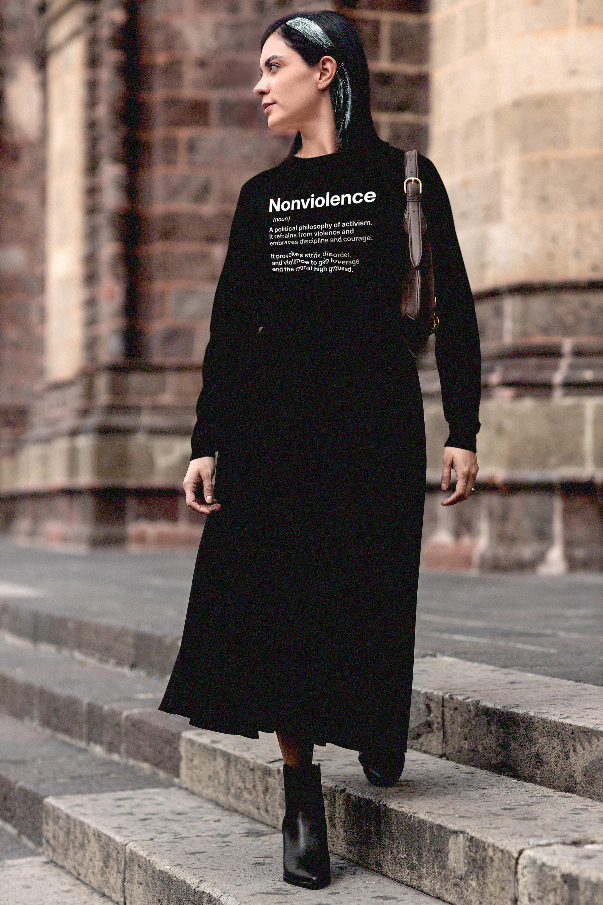NONVIOLENCE (noun) A political philosophy of activism. It refrains from violence and embraces discipline and courage.
